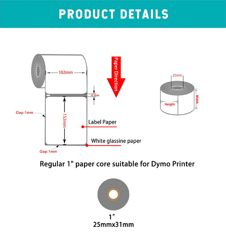 | Material | Paper labels: Direct Thermal Labels (Heat Sensitive, No Need Ribbon) White Glassine Release Paper With Perforation Between Each Label |