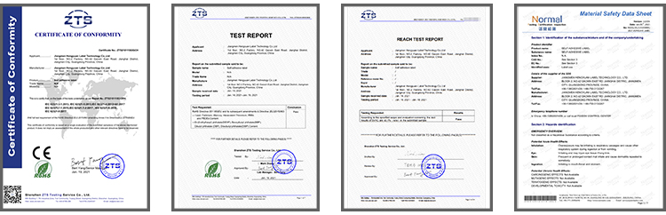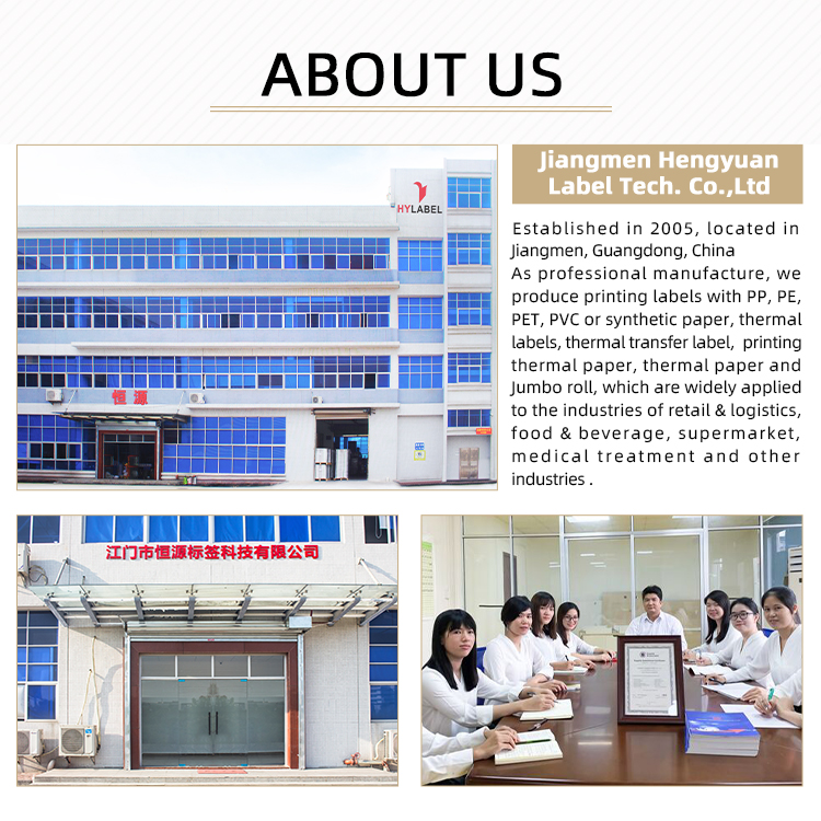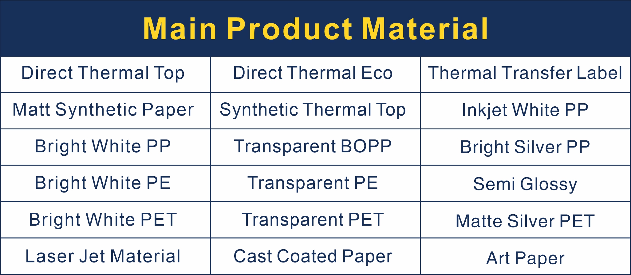 | Material | * Paper labels: --Direct Thermal Labels (Heat Sensitive, No Need Ribbon) --Thermal Transfer Label(Need Ribbon) --Synthetic Thermal Label(Untearable) --Injekt White,PET,PE,Cast Coat,Art Paper and so on. * Grade A Quality: Water proof, Strong Adhesive, Dark printing image. |