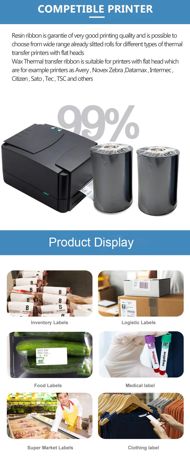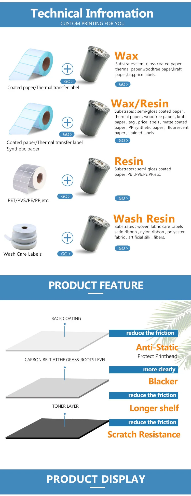 Material:Wax, Wax Resin,ResinA.How to choose Ribbon Material?If print on Paper label, normally choose Wax Ribbon; If pirnt on PP label, or glssoy Paper label, choose Wax Resin Ribbon; If print on PET,PVC label etc ,choose Resin ribbon.B.Printer and its ribbonNormally the printer,decide 3 item info of the ribbon: a.The maximum width and length of the ribbon; b.The ribbon ink side:ink out or ink in; c.Flat head ribbon or near edge ribbon;(Printer head has two kinds:Flat print head and near edge print head, normally is flat head,few is near edge print head)