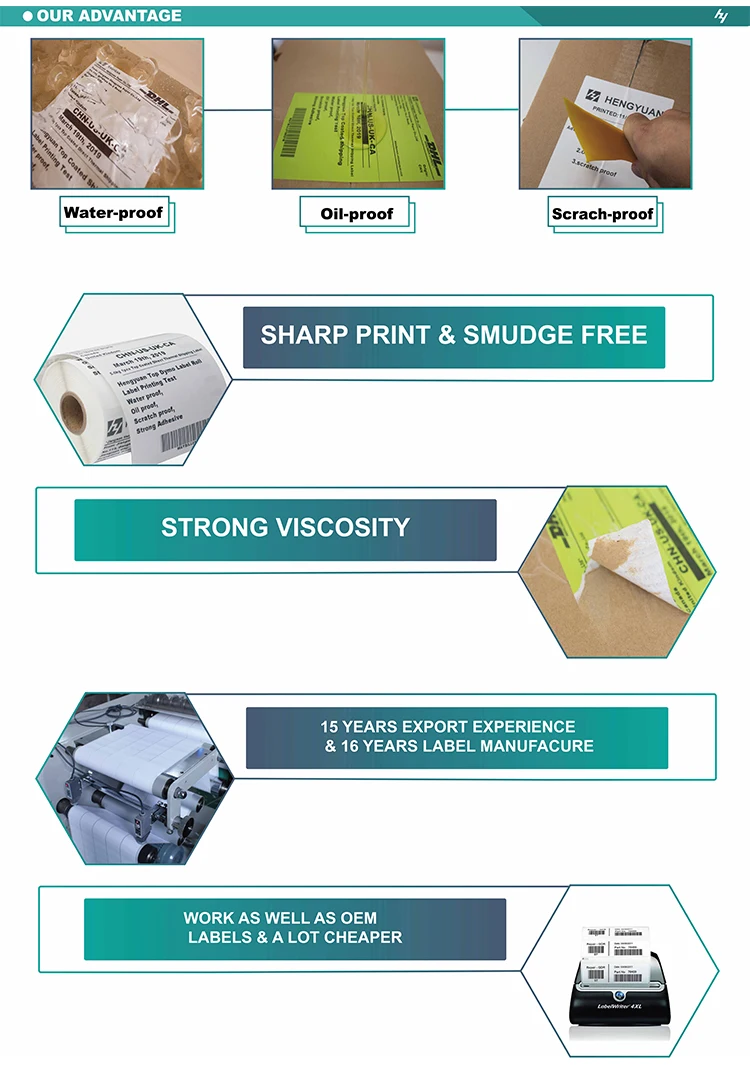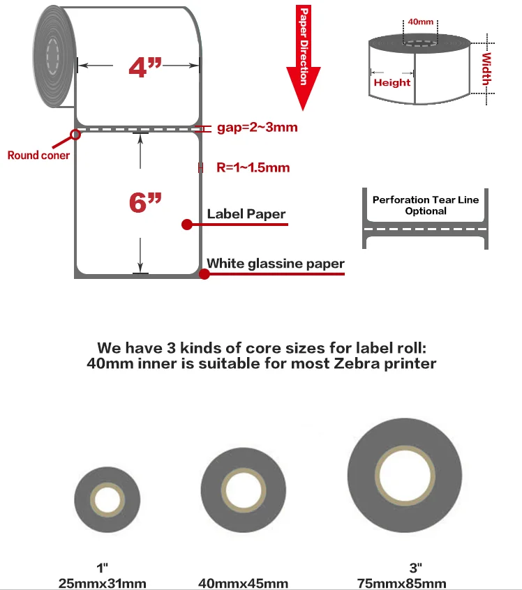 | Material | Paper labels: Direct Thermal Labels (Heat Sensitive, No Need Ribbon) White Glassine Release Paper With Perforation Between Each Label |